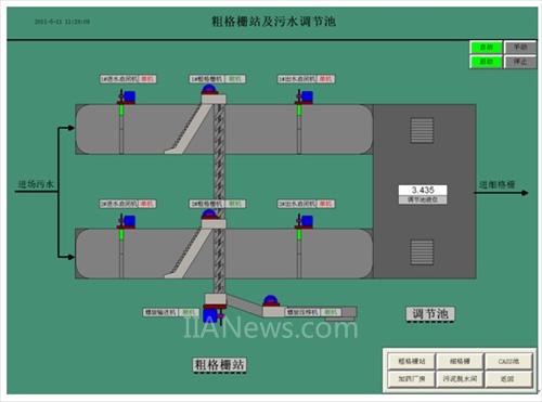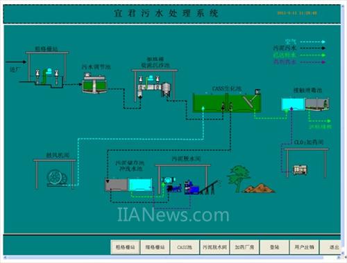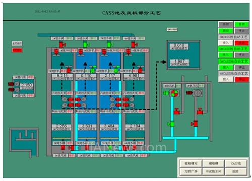 进厂污水通过粗格栅过滤后,进入污水调节池,再经过污水提升泵提升后,经过细格栅,之后进入沉砂池,再进入CASS池进行曝气处理,曝气后再进行沉淀,沉淀后将污泥排到污泥储存池,然后再进行污泥脱水。CASS池的污水沉淀后排到接触消毒池,通过加药间进行化学处理,从而达标排放。还有其它一些报表,交接班等辅助界面。