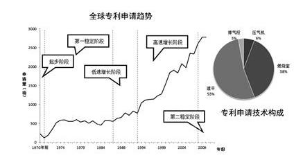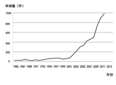 “截至2013年5月30日,全球关于重型燃气轮机的专利申请共计48197项。”《报告》将全球专利申请趋势分为五个主要阶段,从图1可见,从上世纪80年代后期开始,燃气轮机的全球专利申请量一路上涨。“特别是从1994年起,受计算机技术、新材料、新工艺的普及推广以及90年代全球经济高速增长的影响,全球专利申请量进入了一个高速增长阶段,平均年增长率达到18%,在2009年至2011年期间一直保持年均2700多项的高点。”