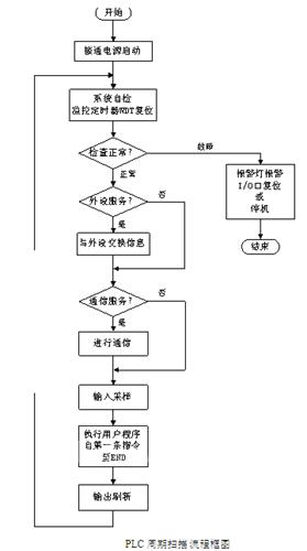 PLC的扫描周期一般包括系统自检、外部设备服务、通信服务、输入采样、程序执行、输出刷新等六个阶段。PLC周期扫描流程框图见图。