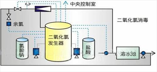 2. ClO2投加量控制:系统控制需要严格控制加入反应器里的ClO2的浓度,能够使水充分的消毒,又不会太多形成二次污染,所以对氯气的控制精度要求极高。具体方法是ClO2的投加量根据待消毒水流量和单位投加量计算,而后,感测器将水中的余氯量反馈到控制器(PLC),将余氯量与设定值(目标值)进行比较并根据二者的差值确定单位投加量的纠正的速度和幅度,计算出新的单位投加量,从而将投加量控制在合理的范围内,水流量×ClO2单位投加量→计量泵的输出频率余氯高于设定值(即目标值)后,减小单位投加量,减小量由差值大小控制。余氯低于设定值(即目标值)后,增大单位投加量,增大量由差值大小控制。