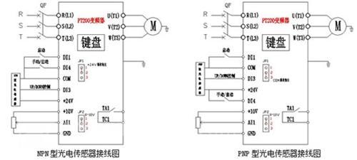 欧科传动PT200系列扣板机专用变频器,利用欧科传动软件独有的特殊算法,能满足扣板机特殊的工艺控制要求,参数设置更为灵活,控制线路更加简单,产品适应性广。DI1控制变频器的启停,DI3接光电开关的输出端,进行UP/DOWN控制,DI4为手动、自动切换开关,手动时电位器调速,自动时UP/DOWN控制。手动转到自动、UP转DOWN、DOWN转UP的跳跃频率可以通过参数自由设置;通过灵活设置FDT电平检测值与滞后值可以达到UP/DOWN超时报警输出功能;UP/DOWN速率根据生产工艺要求自由调整,使得控制更加人性化。