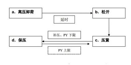 a.高压卸荷:当投料过滤过程完成后,按“程序启动”按钮,启动压滤机开始卸料,高压卸荷阀将油缸内的高压卸掉,以防止压紧板松开时液压系统受冲击。高压泄荷时间由 PLC 控制,当延时时间达到后,压滤机自动转入压紧板松开状态。