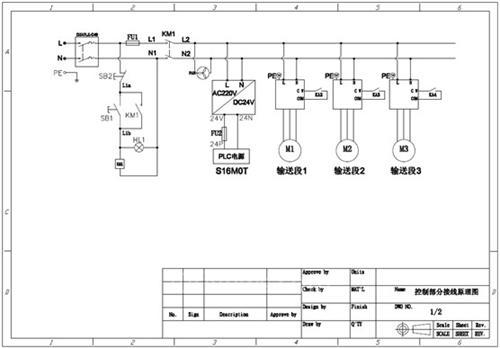 电气绘图:根据要求,选用了3个对射型光电开关和2个光纤传感器。用CAD绘出了电气控制原理图和PLC接线图: