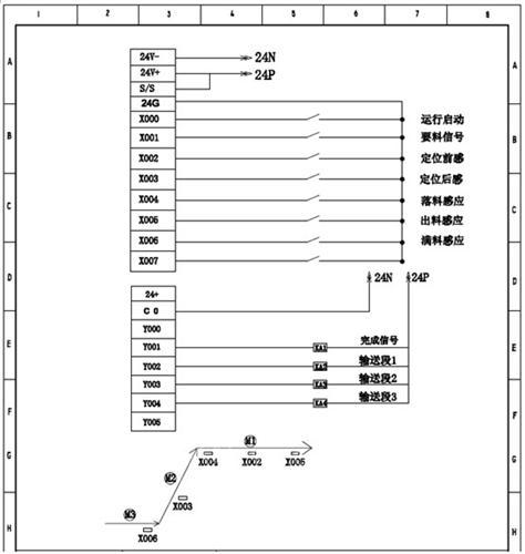 控制要求:启动送电线输送线X0,人工把包扎好的电线放入输送线3,满料X6感应后延时停止;输送线1首先准备好接料(X2感应即停止),当X4入口未感应时输送线2启动,输送线2运行直至X4感应后停止(X3感应即停止);输送线1在X4感应后启动,步进1格(X2感应即停止),直至物料到出口X5有感应后停止;包装总线发出指令X1要料信号,输送线1前进1格,把X5感应到的物料放到总包装线上,输出完成信号Y1。