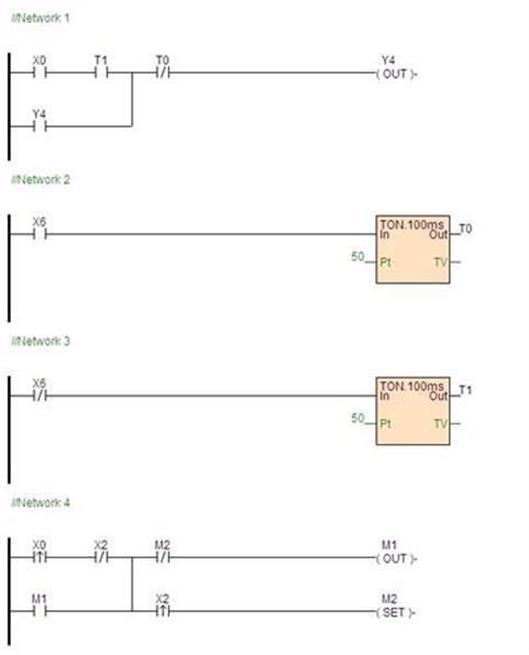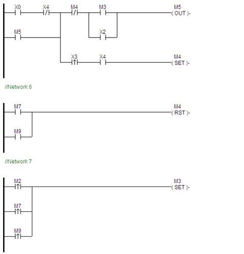 程序编制:根据设备工艺要求和电气原理图来设计PLC 程序。海为公司为了用户更好的应用PLC,还是做了大量的程序示例。海为的编辑软件用着也挺好用,一下子就习惯了(附部分程序)。