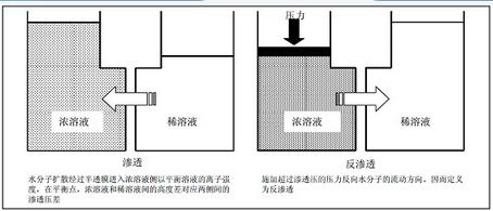 反渗透是反其自然渗透过程的一种科学方法,渗透和反渗透均是通过半透膜来完成的,当用半透膜隔开两种不同浓度的溶液时,稀溶液中的溶剂就会透过半透膜进入浓溶液一侧,这种现象叫渗透。当在浓溶液侧施加一外来压力时,渗透过程即停止,即达到所谓渗透平衡,平衡状态所需要的外加压力称为渗透压差。渗透压是溶液本身的一种性质,其值与膜无关。当继续增大浓溶液一侧的压力,即所施压力大于渗透压力时,溶剂会反其原来的渗透方向,由浓溶液侧通过半透膜进入稀溶液侧,这种现象称为反渗透,如图1。