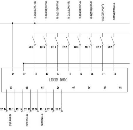 6)阻垢剂计量泵与高压泵联锁启停,絮凝剂计量泵、加酸计量泵与增压泵联锁启停,以上连锁都是通过外部接触器辅助触点控制。