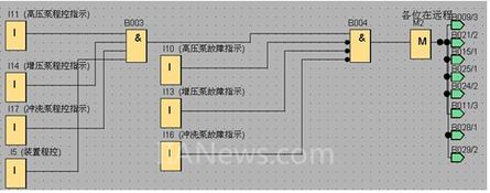 1)远程:将各设备转换到远程状态,并且无故障时才能自动运行,为防止设备损坏,当有任何一台电机故障时都将停止自动运行,程序如图7所示。