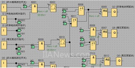 3)开机冲洗及正常运行:系统开机M1闭合后,当I21浓水箱高液位闭合时,且I2冲洗电动阀关状态处于闭合时,延时30S后打开Q2浓水排放阀, I3浓排阀开状态闭合后,开启Q6增压泵,进入开机冲洗状态。开机冲洗5Min后关闭浓排阀,浓排阀关指示I4闭合后启动Q5高压泵,系统进入正常运行状态,程序如图9。