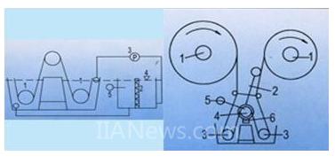 图二是卷染机工作的示意图,这是一个典型的中心卷曲控制系统。未染色的布匹首先通过上布电机卷曲到其中的一个辊筒上,在辊筒的传动轴上安装有计数用的接近开关,此时控制系统计下整卷布的道次,上卷完毕,采用人工的方式把布匹的一头卷到另外一个辊筒上面,待包覆紧密即可正常开始工作。此时两个辊筒朝着同一个方向运转,控制的要求是保持布匹上的张力恒定,保持布匹在染液经过的时间一致,也就是线速度恒定。这是个没有线速度反馈的驱动系统,但线速度又实实在在的随着辊筒的半径的变化在变化。因此,控制系统需要适应这种独特的要求。