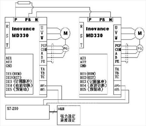 该卷染机的控制系统以西门子作为控制器,采用触摸屏作为人机界面,它们主要完成的是张力,线速度的设定,布的厚度的测量以及相关逻辑动作的控制。变频器和PLC之间采用485通讯。采用通讯方式的好处是可以随时知道变频器主要变量的信息,减少接线,使得整个系统看起来很精简。接线示意可见图三。由图中可见:两台完全一样的变频器,它们均工作于闭环矢量控制模式,由于卷染机在接近满卷时候会较长时间工作在很低的频率下(1~3Hz),采用较高线数的编码器有助于提高在低转速工况下的控制性能,同时考虑散热,需要采用变频专用电机。