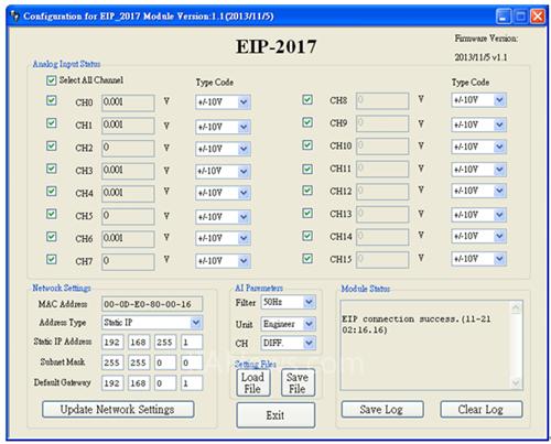 EIP-2017是EtherNet/IP远程8通道差分输入的模拟量模块,在经由跳接后可支持16通道单端输入模块,模块提供电压及电流的测量,在差分输入电流测量模式下可支持8个内建电阻(125Ω)供使用者跳接,用户可以通过LED的显示状态得知系统的测量的情况。使用本公司所提供的工具软件,可以让用户通过以太网络更便利的设置EIP-2000系列产品。