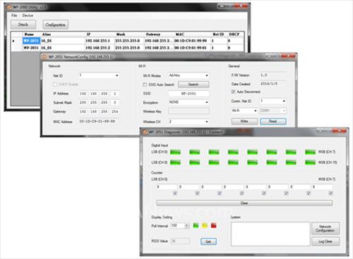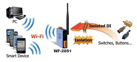 WF-2051为WF-2000无线产品家族成员之一,其为具备16通道隔离数字量输入(8通道含32位计数器)的无线I/O模块。除此之外,WF-2051也符合IEEE 802.11 b/g的无线网络标准。随着网络基础设施的普及与移动技术的进步, WF-2051可轻易的融入无线网络中,通过Modbus TCP/UDP通信协议与网络加密的配置,用户可轻易将WF-2051整合到任何SCADA 软件,为用户提供方便、安全的无线I/O解决方案。