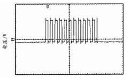 发射管选取SIR204-A型发射管,该红外线二极管驱动电流范嗣为20~100mA,其正向导通压降为1.3~1.5V,发出红外线光波长范围约为835~930nm,发射角度为30°,直射时红外线光强度最大。发射管驱动电压采用脉冲电压,38kHz载波频率,发送时长为280μs,占空比为1/2的方波,发送间隔为720μs。载波脉冲需要与红外线接收管的型号相匹配。红外发射管能够匹配光电晶体管、光敏二极管和红外接收器模块,红外传感器的接收部分选择了带有放大和滤波功能的红外线接收二极管。发射部分的设计需要考虑到接收部分的制约。经过验证调制脉冲驱动电流能够匹配红外线接收管,将红外线接收管导通。驱动发射管PWM的波形如图1所示。