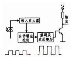 红外线对射管的驱动分为电平型和脉冲型两种驱动方式,本系统中红外传感器选用脉冲型驱动方式。由红外线对射管阵列组成分离型光电传感器。该传感器的创新点在于能够抵抗外界的强光干扰。太阳光中含有对红外线接收管产生干扰的红外线,该光线能够将红外线接收二极管导通,使系统产生误判,甚至导致整个系统瘫痪。本传感器的优点在于能够设置多点采集,对射管阵列的间距和阵列数量可根据需求选取。