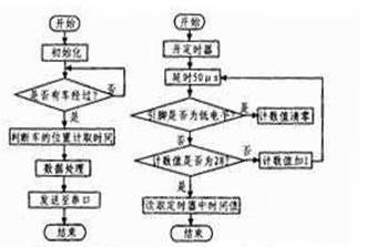 控制软件需要保证红外线对射管一对一工作,且对信号采集处理,对采集的信号编写算法程序,完成对物体是否遮挡红外线对射管的判定,即分辨红外线接收管是否被导通。通过单片机内部计数器计取脉冲个数,可以将物体遮挡某个红外线接收管的时间记录下来。程序流程如图5(a)所示,需要不断判定第一个红外线接收管的输出状态,当确定有物体遮挡时,将开始标志位置为1,单片机开始读取其他接收管状态,同时启动定时器,下一对红外线对射管的接收管被遮挡停止计时。红外线发射管按顺序依次发射红外线,处理单元依次读取红外线接收管状态,可以防止鸟或人无意遮挡引起的误判现象。判断有物体遮挡的程序思想为判断1ms内,是否有物体遮挡,若没有物体遮挡,红外线接收管输出的脉冲波形保持不变;若有物体遮挡,红外线接收管输出高电平持续1ms以上。红外线接收管输出状态是否为高电平,可以判断是否有物体遮挡。当按顺序扫描的前一对红外线对管被判定遮挡时,开始扫描下一对管子的脉冲个数,同时开启定时器。延时50μs,判定接收管接收到的是否为脉冲,判定是否为脉冲则需要判定引脚是否为低电平,如果引脚为低电平,计数值清零。计数值并不是计数器的值,而是计算延时50μs的次数是否达到28。