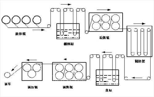 在纺织行业中,对棉纱高温染色与上浆的加工程序应用非常普遍,生活中我们所穿的牛仔面料的纱线均通过上述加工过程实现。该种加工设备通常被称为浆纱机,示意图如下: