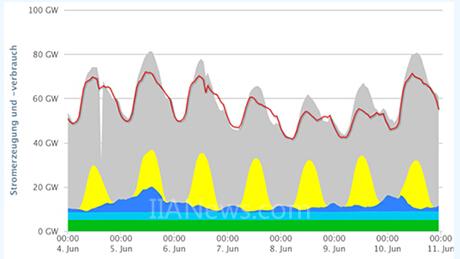 黄线是光伏,蓝线是风力,灰色是总体发电出力,而红线就是德国总体的电力负荷需求。不难看出,6月9日就光伏出力而言并不是最高,才刚刚超过23GW,之前的6月5日和前不久的7月3日绝对数量上都有超过。而之所以引人注目以6月9日作为标杆,是因为相比之下这天的电力负荷非常低,所以才使得光伏发电所占比例凸显。