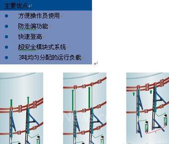 爬高时,上夹紧带被释放,然后由协调工作的执行器向上推高1.2 米,然后再被夹紧,下环被释放。然后执行器收紧,平滑地将下平台拉上去,下平台再被夹紧。下降时过程相反。这意味着整个平台一体式升高和下降,而不是像传统登高平台那样分段进行,这样有效确保了工作环境的安全。