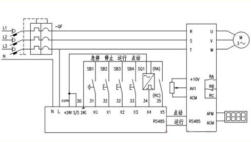 变频器多项对输出的保护功能使我们无须对电动机另加保护环节,直接接于变频器的输出端子上即可。针对变频器的输入端保护相对较为薄弱,在输入端加上无熔丝断路器,如图中的QF。