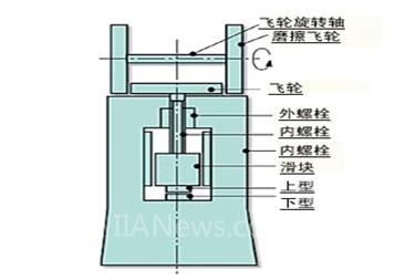 本文介绍的压力机是螺旋压力机。螺旋压力机是用螺杆、螺母作为传动机构,并靠螺旋传动飞轮的正反向回转运动转变为滑块的上下往复运动的锻压机械。启动时,滑块从起始位置快速加速到指定速度,快接近工件时,飞轮失去控制,自由减速,存贮在旋转飞轮的动能转化为冲击能,打击工件后,要求飞轮快速反转(0.1S左右)离开工件,返回到某一位置后准备下一次打击。
