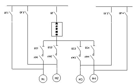 ⑤ 当变频器出现故障或需要检修时,只要断开QF和QS1 ~QS4即可。变频器具有反风功能。柜门上有1~4 风机运行指示,KM1 ~KM4,分闸和合闸指示。