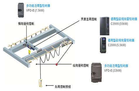 吊控制系统, VFD-E系列进行天车主吊的横向或纵向运动控制。