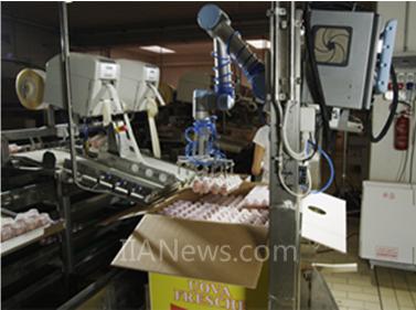 在意大利的Cascina Italia工厂,一个在包装流水线上工作的协作机器人每小时可以处理15,000个鸡蛋。这种机器人配备了气动夹具,可以完成10枚装蛋托的装箱操作。由于每个蛋箱装有9层10枚装蛋托,因此这项工作需要非常精确的操作和小心的放置。