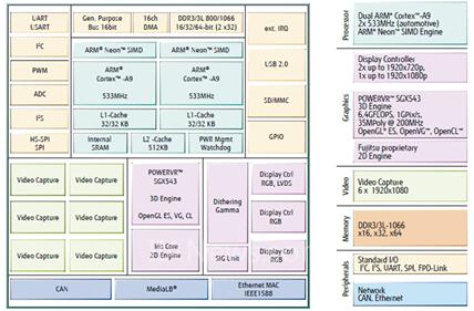 MB86R20系列产品具有增强的CPU和GPU处理能力。其CPU采用了2个ARM Cortex-A9,3D图形引擎采用POWERVRTM SGX543,与第二代车载SoC芯片MB86R10系列(Emerald)相比,CPU、GPU的性能分别提高2倍和5倍。此外,该系列还内置了富士通半导体自行开发的二维图形引擎,可实现图像的自适应卷绕(Warping on-the-fly)等功能,由于采取各部分独立工作的模式,因此可获得更高的性能表现。