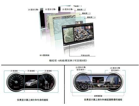 此外,MB86R20系列所具有的超高性能的绘图功能还特别值得一提,其二维图形处理引擎、三维图形处理引擎和视频捕捉器可同时独立工作,并根据不同的应用和显示内容在8个不同的描绘层上进行最佳的图像处理。例如,仪表显示屏上的指针和车身描绘在不同层分别进行二维/三维处理,可实现超越规定性能指标的高度绘图功能。