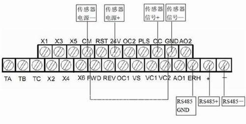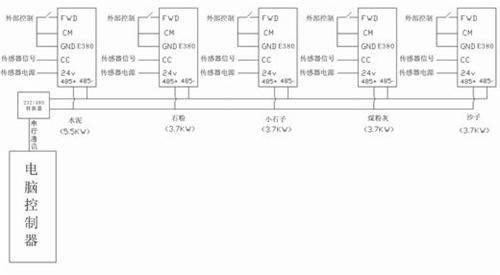 在该设备上,变频器作为连接微机控制系统和动力装置的重要设备,起到电机运转,信号采集传送,微机指令实现等重要功能,通过变频器调节电机转速实现原料的精确配比。其电气接线如图所示(可根据实际配料情况增加或减少变频器):