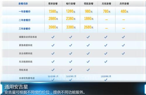 有数据统计,通用汽车在2008年底北美上市的95%的产品都安装了OnStar系统,可见其对于通用的重要性以及必要性。该系统将通过应用全球卫星定位系统(GPS)和无线通信技术来为消费者提供广泛的汽车安全信息服务,包括路边救援等十多项功能。目前通用安吉星的免费使用时间是1年,此后该系统一年套餐价区间为480-1580元,除碰撞自动求助系统、紧急救援、安全保障系统等必备功能外,可对车况检测系统、导航系统、全音控免提电话等功能根据自身需求进行选择,并且相对其他车联网服务选择性更大。