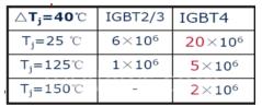 (5)第四代IGBT与第二代第三代IGBT相比较,在功率循环寿命方面表现优异,具体如下表: