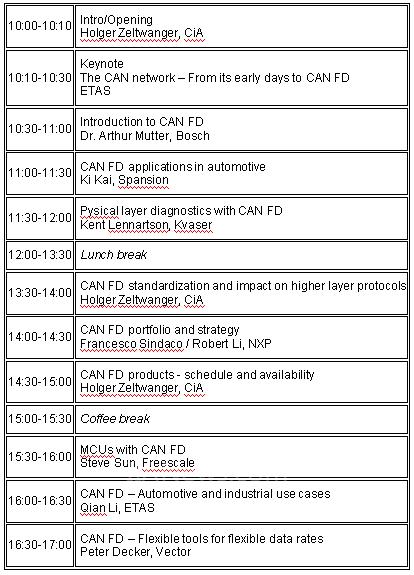 会议日程安排请见邀请函背面。 我们诚挚欢迎您报名参加于上海举办的CAN FD Tech Day活动,并期待您的莅临。 更多有关CAN FD的背景资料及信息可在我们的在线杂志 CAN Newsletter Online () 上阅读。 如有任何问题,请随时致电或邮件至CiA办公室咨询。 致以诚挚的问候, CAN in Automation国际用户与制造商联合组织 Holger Zeltwanger 地点: 上海浦东证大丽笙酒店木兰厅 (上海市浦东新区迎春路1199号) 日期: 2014-09-09 会议安排: (转载)