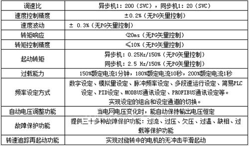 Goodrive300变频器是深圳市英威腾电气股份有限公司新开发的一款高性能开环矢量变频器,具有V/F和无PG矢量两种控制模式,其中在突加减载荷的情况下,速度波动非常轻微;可支持永磁同步电机、变频器电机、直驱电机等,可以为用户减少库存,不再需要为不同的电机备用不同变频器的库存;具有准确的电机参数自学习功能,支持旋转自学习与静态自学习,其中静态自学习可以在电机无法脱开负载的场合准确的学习电机的参数;具有先进的全程三相调制方式,使电机运行更平稳,噪音更小;其他的特性参数、功能如下表所示: