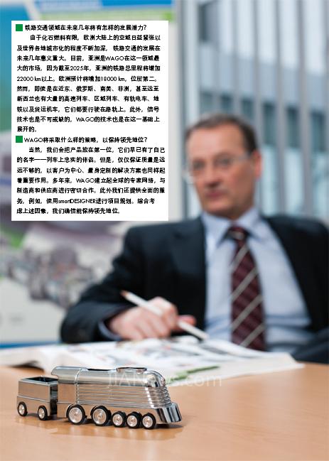 多年来,WAGO一直是铁路行业的重要一员——甚至成为了弹簧连接技术领域的全球领导者。Richard Markus先生对其中的原因作出了解释。在采访中,这位市场经理谈到了铁路行业的发展前景、轨装式接线端子的重量等问题。