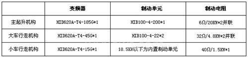 合康变频根据现场实际情况,考虑到本类起重机的总工作时间并不长,能够方便维护,综合两者的性价比后,本项目采用第一种处理方案,具体制动单元及电阻器的选型请参考合康变频《HIB100制动单元选型说明》。