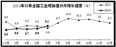 (一)生产增势缓中趋稳,向好趋势逐月增强。国家统计局发布的数据显示,上半年,全国规模以上工业增加值同比增长8.8%,增速同比回落0.5个百分点。其中,一季度增长8.7%,二季度增长8.9%,6月当月增长9.2%。从环比看,4、5、6三个月分别增长0.71%、0.72%和0.77%,环比增速连续两个月加快。占规模以上工业增加值比重达82.4%的制造业上半年增加值同比增长9.9%,增速同比仅回落0.1个百分点,运行态势好于整体工业。另据国家统计局初步核算,上半年,全部工业增加值达到10.68万亿元,同比增长7.2%。