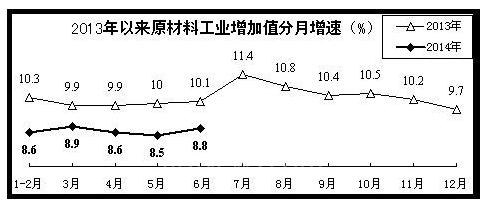上半年,原材料工业增加值同比增长8.6%,增速同比回落1.4个百分点,比一季度减缓0.1个百分点。6月份,原材料工业增加值同比增长8.8%。上半年,原材料行业实现利润总额5376亿元,同比增长9.6%,增速同比增加0.7个百分点,比一季度提高3.8个百分点。今年以来,原材料行业生产经营困难较为突出,既受市场需求放缓、产能过剩矛盾突出等因素影响,也与国家主动加大调结构力度有关。