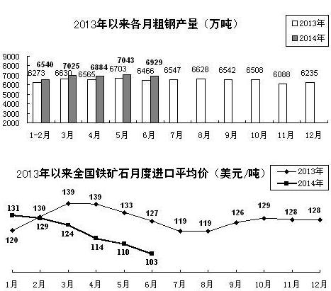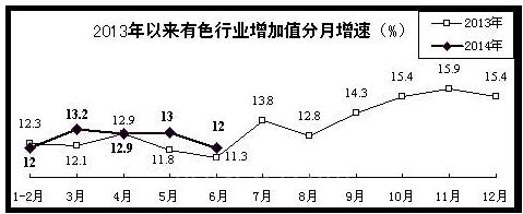 冶金:上半年,冶金行业增加值同比增长7.7%,比去年同期回落3.4个百分点。全国粗钢产量4.12亿吨,钢材产量5.52亿吨,同比分别增长3%和6.4%,增幅同比分别回落4.4个和3.8个百分点。国内粗钢表观消费量(生产量-出口量+进口量)为3.76亿吨,同比仅增长0.4%,生产增长主要靠出口消化。钢材出口量升价跌。上半年,全国累计出口钢材4101万吨,同比增加1031万吨,增长33.6%;钢材出口平均价格为792美元/吨,同比下降9.1%。钢材价格总体呈低位运行态势。今年以来,受产能加快释放影响,钢材市场供需矛盾进一步加剧,价格持续下跌。据钢铁工业协会统计,6月30日,国内市场钢材综合价格指数为92.99点,比2013年12月末下降6.2%,并为2006年2月份以来最低水平。盈利状况有所改观。得益于进口铁矿石价格明显下降(到6月末铁矿石价格比年初下降了近1/3),钢铁行业经营状况有所好转。中国钢铁工业协会统计的会员钢铁企业,1、2月份盈亏相抵盈利状况分别为净亏损11.34亿元和17.52亿元,从3月份开始实现扭亏为盈,3-6月分别实现利润5.3亿元、12.25亿元、28.47亿元和57.61亿元。