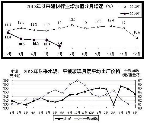 建材:上半年,建材行业工业增加值同比增长10.5%,增速比去年同期减缓1.6个百分点,比一季度回落0.5个百分点。主要建材产品产量增速放缓。上半年,水泥产量11.4亿吨,增长3.6%,同比回落6.1个百分点;平板玻璃产量4.11亿重量箱,增长4.7%,同比回落6.1个百分点。水泥、平板玻璃价格呈现不同程度下跌,但总体仍高于去年同期。据建材联合会统计,6月份,重点建材企业水泥月均出厂价347.99元/吨,比去年末下跌5.64元/吨。受新增产能释放影响,平板玻璃价格下跌明显。6月份,平板玻璃月均出厂价61.1元/重量箱,较上年末下跌2.4元/重量箱。效益状况良好。上半年,建材行业实现利润总额2011亿元,同比增长18.8%。主营业务收入利润率为6.29%,同比提高0.31个百分点。其中,水泥和平板玻璃实现利润分别增长52.7%和24.1%。