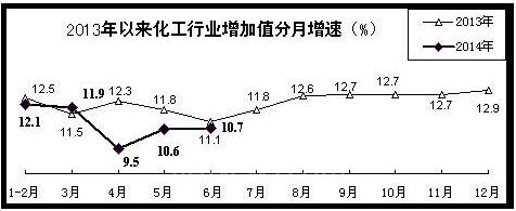 石化行业:上半年,受国内外和下游市场需求放缓以及产能过剩矛盾突出等影响,石化行业生产、投资增速回落,主要产品价格下跌,企业效益状况下降,下行压力依然较大。生产增势放缓。石化工业完成增加值同比增长7.1%,增速同比回落0.8个百分点,比一季度减缓0.1个百分点;其中化学工业增加值增长11.1%,同比回落0.7个百分点。部分行业开工率严重不足。据石油和化学工业联合会统计,上半年,炼油行业装置平均开工率仅为70%,烧碱开工率约为80%,聚氯乙烯开工率不足70%,电石开工率仅为65%,甲醇开工率为62%。投资增速高位回落。上半年,石油和天然气开采业,石油加工、炼焦和核燃料加工业完成投资同比分别增长18.5%和7%,增速同比分别回落7.2个和14.3个百分点;化学原料和化学制品业、橡胶和塑料制品业完成投资增长7%和17.1%,回落7.3个和3.9个百分点。盈利能力下滑。综合生产成本上升和产品价格下降继续挤压企业利润空间。上半年,石化行业实现利润同比增长6.3%。其中,石油及炼化行业利润增长3.9%,化工行业利润增长9.2%。上半年,化工行业主营收入利润率仅为4.5%,同比下降0.05个百分点。