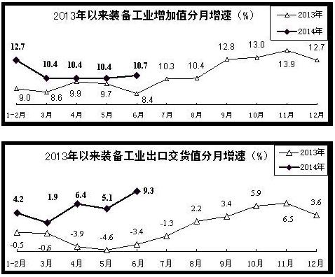 今年以来,装备工业生产和效益同步回升,提质增效升级步伐加快,运行态势良好。生产增势基本平稳。上半年,装备制造业完成增加值同比增长11.2%,增速同比加快2个百分点,其中,1-2月份增长12.7%,3、4、5三个月均增长10.4%,6月份增长10.7%。分行业看,汽车制造业、通用设备、专用设备制造业增加值同比分别增长13.4%、9.9%和8.6%,增速同比分别加快1.7个、0.7个和1.4个百分点,铁路、船舶、航空航天和其他运输设备制造业增长11.2%,加快9个百分点。出口好于去年同期。上半年,装备制造业完成出口交货值同比增长5.8%(去年同期同比下降2.9%),其中6月份增长9.3%(去年同期同比下降3.4%),在去年较低基数呈现恢复性增长态势。投资增长加快。上半年,装备制造业完成固定资产投资2.15万亿元,同比增长15.7%,增速同比提高2.1个百分点,占制造业固定资产投资比重的29.6%。效益水平继续提升。在汽车行业利润快速增长等拉动下,上半年,装备制造业实现利润总额7145亿元,增幅达20%。主营业务收入利润率为6.85%,同比提高0.49个百分点。结构调整和转型升级呈现积极变化。上半年,金属切削机床数控化率达到30.2%,同比提高3.5个百分点。节能环保设备生产增势良好,大气污染防治设备产量增长14.2%。我国自主设计研制并代表世界最高水平的±800KV直流输电换流变电器通过产品技术鉴定,±1100KV直流干式平波电器和1100KV交流变压器绝缘完成技术鉴定。