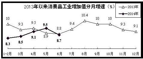 消费品工业运行态势总体平稳。上半年,完成增加值同比增长8.7%,增速同比回落0.6个百分点,比一季度加快0.4个百分点。出口交货值同比增长5%,比去年同期回落1.9个百分点,比一季度加快1.1个百分点。上半年,消费品工业实现利润总额9036亿元,同比增长10.8%;主营业务收入利润率为6.08%,比去年同期略有提高。
