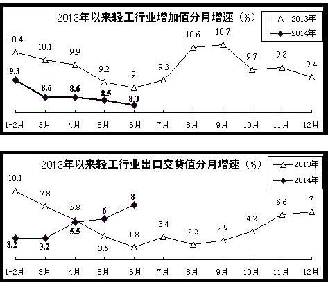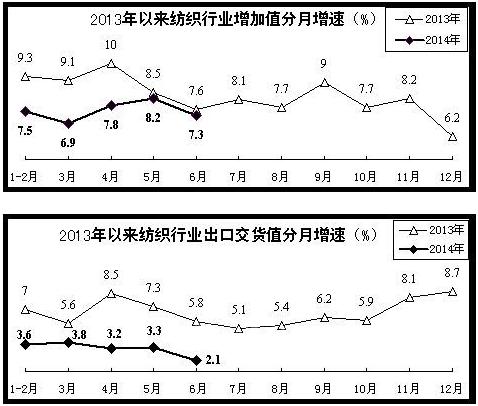纺织:上半年,纺织行业完成增加值同比增长7.5%,增速同比回落1.4个百分点,比一季度加快0.2个百分点。主要产品中,纱、布产量分别增长8.7%和3%,服装产量增长3.8%,化学纤维产量增长7.5%。出口形势总体低迷。上半年,规模以上纺织企业完成出口交货值同比仅增长3.6%,增速同比回落4个百分点。另据海关统计,上半年,我国纺织纱线、织物及制品出口额,服装及衣着附件出口额,同比分别仅增长4.2%和4.1%。据纺织联合会反映,前5个月在美国、日本纺织品服装进口份额中,我产品占比分别为35.3%和67.1%,同比分别下降0.8个和3.9个百分点,我纺织品服装在欧盟进口份额中也呈下降趋势。行业投资保持较快增长。上半年,纺织业和服装服饰业完成固定资产投资同比分别增长14.9%和20%,增速同比加快4.2个和1.4个百分点;化学纤维制造业投资增长14.1%,同比回落5.3个百分点。盈利水平有所提高。上半年,规模以上纺织企业实现利润1444亿元,增长11.9%;主营业务收入利润率4.74%,同比提高0.14个百分点。