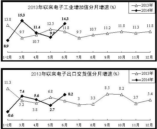 在信息消费拉动下,电子制造业保持较快增长态势。上半年完成增加值同比增长11.6%,增速同比加快0.2个百分点,比一季度提高0.3个百分点。主要产品产量中,移动通信基站设备增长146%,笔记本计算机增长9.6%,彩电产量增长12.6%,手机产量增长14%。出口增速放缓。上半年,出口交货值同比增长3.6%,增速同比回落3.7个百分点,比一季度提高0.7个百分点。其中,电子计算机、电子元器件和通用设备出口交货值分别增长1%、1.1%和10.8%,增速同比回落1.9个、5.7个和12.8个百分点。家用视听设备在去年同期下降4.2%的基础上增长9.1%。盈利状况有所改善。上半年,电子制造业实现利润总额1477亿元,同比增长24.1%。主营业务收入利润率为3.82%,同比提高0.49个百分点。企业亏损面仍然居高不下,达到24.8%。