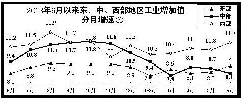 东部地区生产逐步恢复,中西部、东北部地区多数省份继续放缓。上半年,东部地区由于结构调整早,转型升级快,总体表现出较强的抗风险能力,增加值同比增长8.4%,增速同比回落0.3个百分点,比一季度加快0.3个百分点;和一季度相比,10个省份整体呈现“八升一平一降”的态势,其中,北京、河北(仅增长4.6%,同比回落6.7个百分点)、上海、浙江、福建、山东、广东、海南等8个上升;中西部和东北部地区由于基础产业相对集中,产业结构相对单一,增长压力较大。其中,中部地区增加值增长8.8%,增速同比回落1.2个百分点、比一季度回落0.1个百分点。6个省份工业增加值增速较一季度呈现“一升一平四降”的态势,其中,山西工业增加值仅增长4.5%,同比回落6.3个百分点,河南持平。西部地区增长10.8%,增速同比加快了0.3个百分点,比一季度加快0.4个百分点;12个省份工业增加值增速较一季度“五升一平六降”,其中,内蒙古、四川、云南、西藏、陕西上升,重庆持平。东北部地区受能源资源等上游行业不景气的拖累,平稳发展压力大。东北三省工业增加值增速较一季度“二升一降”,其中,辽宁、吉林上升,黑龙江工业增加值仅增长2%,同比回落6.4个。
