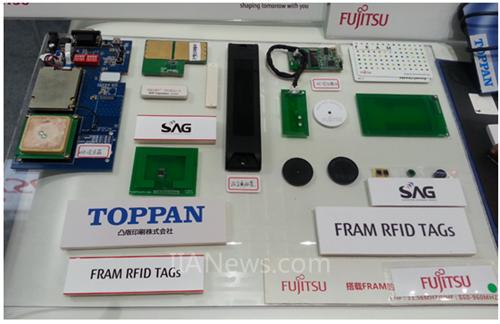 如上图7所示为富士通半导体展台现场展示的搭载FRAM的RFID芯片,此类电子标签具有大容量存储(UHF容量分别为36bytes、4Kbytes;HF容量分别为256bytes 、2Kbytes、9Kbytes)、高速写入、高耐久性(静态功耗小于1uA)、耐放射线性、嵌入式RF(具有SPI串口,可实现与微处理器的连接)的特点。