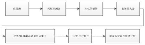 从探测器输出的电信号,经过前置放大电路进行信号放大。然后经过凌华PCI-9846高速数据采集卡进行波形数字化处理,经过上位机用户软件进行数据分析,结合能量标定,即可测量出该微观粒子的能谱曲线。