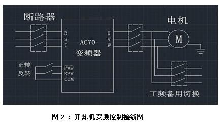 该控制系统通过在炼胶机马达和工频电源之间加装伟创AC70变频器,同时在变频器控制面板上做一部分控制线路的连接,实现了对炼胶机的无级变频调速,实现了对炼胶机马达的平稳启动和速度可调。其反转功能端子能够方便实现在辊筒堵塞时电机反转退胶,操作简易。另外做一个工频切换备用电路,防止万一变频器发生故障不至影响工厂生产。